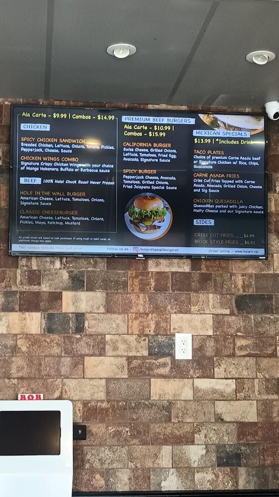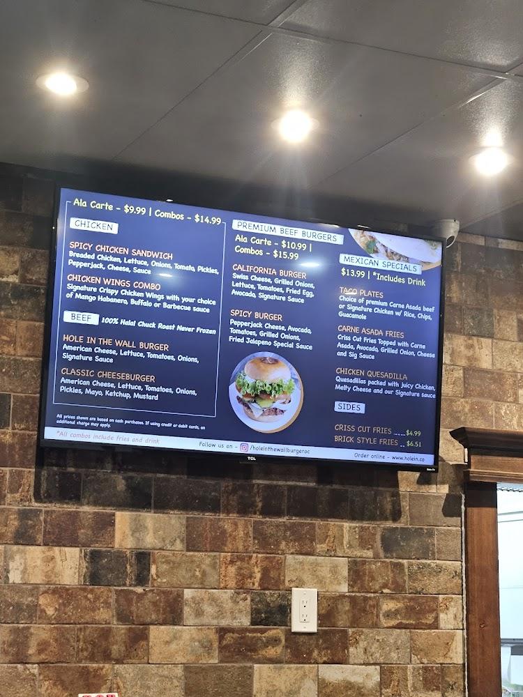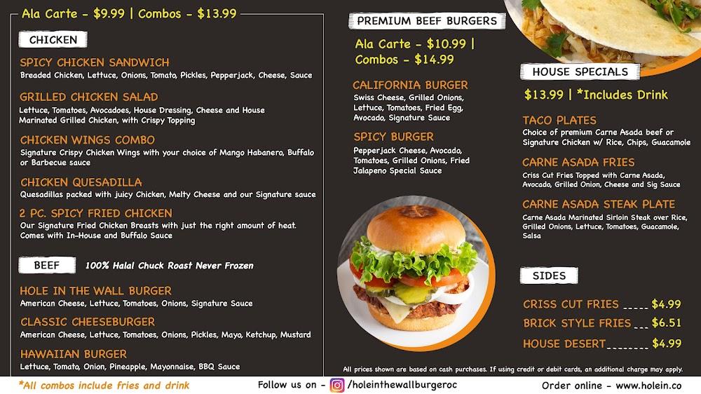 The menu at Hole in the Wall Burger presents an inviting range of options. Burgers feature a classic assortment: the Hole in the Wall Burger and spicy varieties. Each comes with perfectly crispy fries, known as brick-style or criss-cut. For taco lovers, the carne asada taco plate and chicken quesadilla showcase bold flavors and fresh ingredients. Signature combos provide ample choices for satisfying every craving. Beverage options include Mexican Coke and other beverages to complement meals perfectly. Overall, the menu showcases an exceptional blend of classic American bites and traditional Mexican fare, all embracing halal fundamentals.