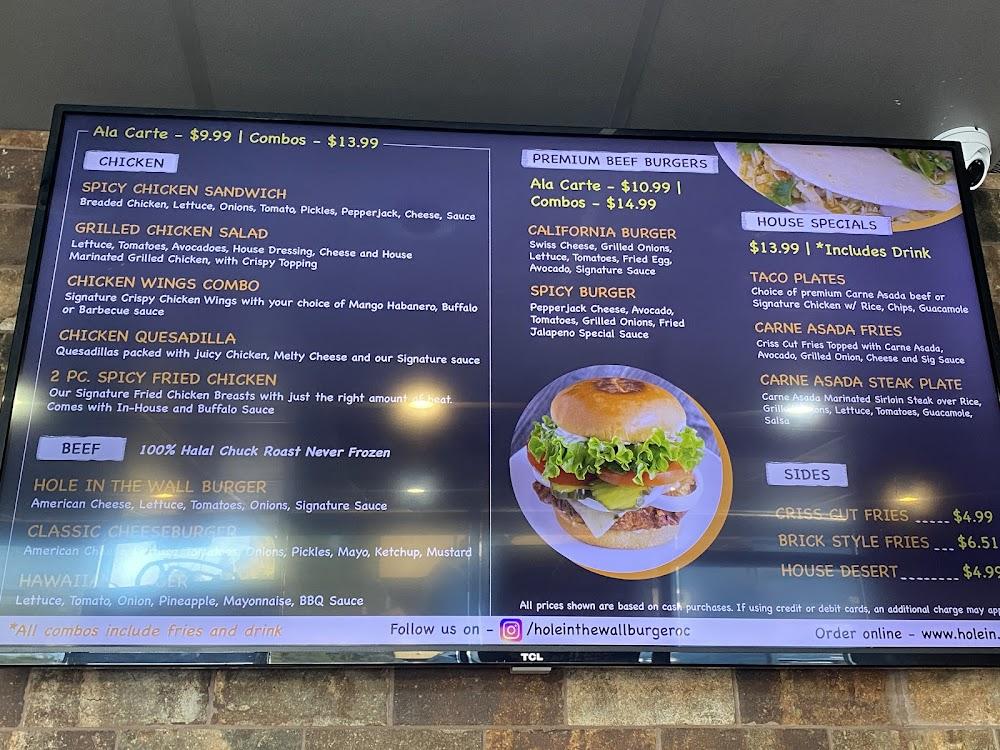 Welcome to Hole in the Wall Burger, your go-to spot for delicious, home-style halal burgers and mouthwatering steak or chicken taco plates—all at reasonable prices! Located in Lake Forest, CA, we pride ourselves on our signature sauces and salsas that elevate every bite. Rated 4.5+ stars on Yelp, Google, and DoorDash, our inviting atmosphere is perfect for solo diners or groups alike. Enjoy dine-in, takeout, or delivery services, and take advantage of our military discounts. We’re committed to accessibility and provide a warm, casual ambiance for everyone. Visit us today and indulge in a culinary experience that satisfies both your cravings and your budget!